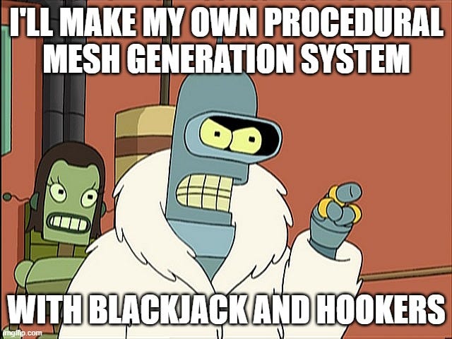 It was simply unrealistic to wait and hope so I started delving into procedural meshes, octrees and quadspheres for mesh generation and, with a little help from Gemini, was able to create a generation system that shows a lot of promise. Effectively what we have now is a planet that generates meshes dynamically at runtime at different levels of detail as needed, based on distance and trajectory of the player. The further away from the player, the less mesh density is required, this keeps the GPU working very efficiently. Here’s an example: